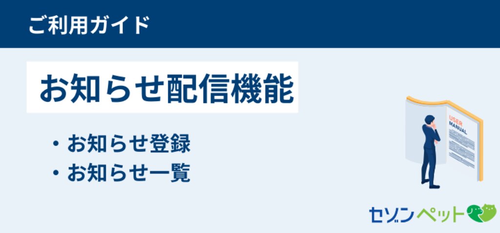 お知らせ配信機能では、飼い主宛てにメッセージを送ることができます。メッセージは飼い主のマイページ「お知らせ」メニューに表示されます。飼い主からの返信機能はありません。