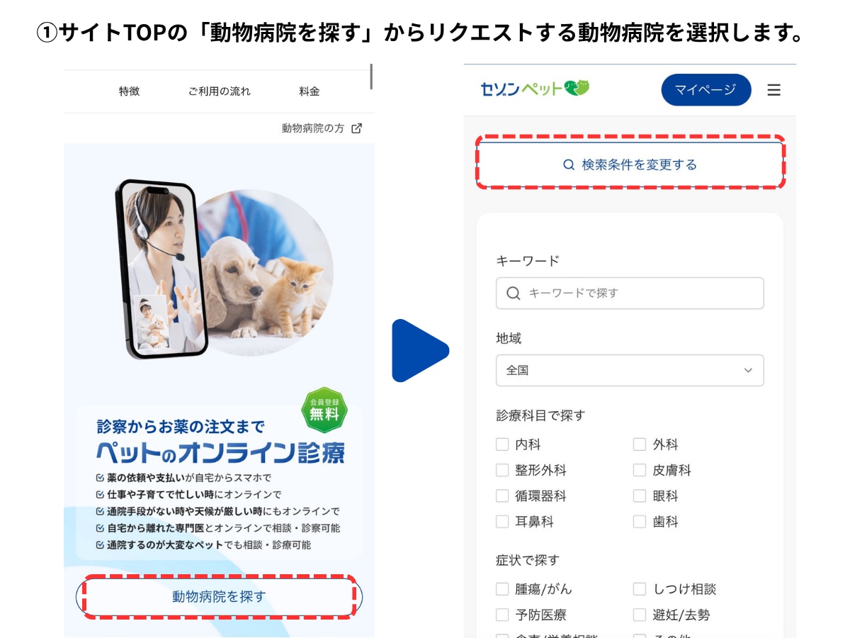 ①サイトのトップ画面から「動物病院を探す」ボタンを押し、リクエストしたい動物病院を選択します。