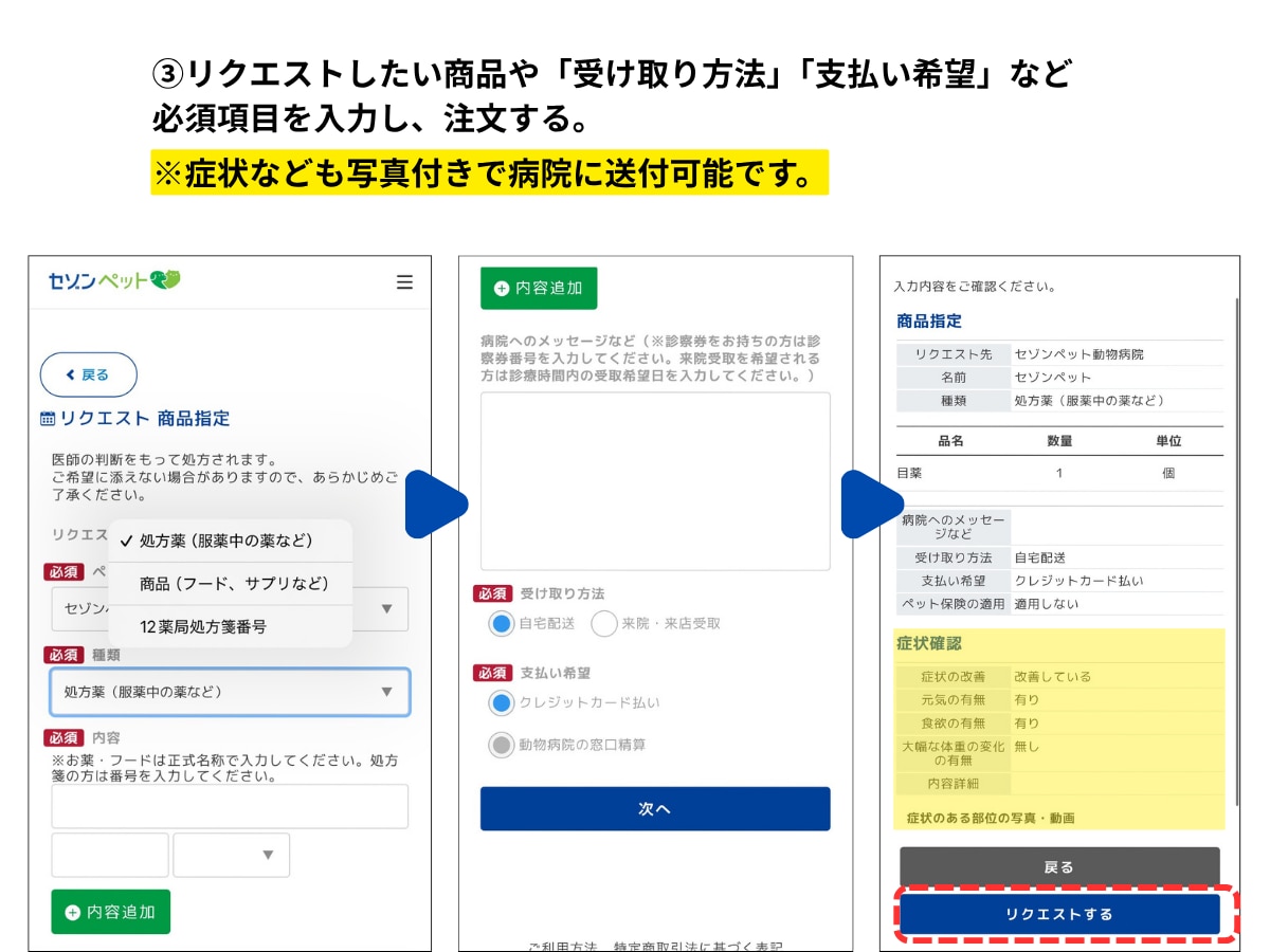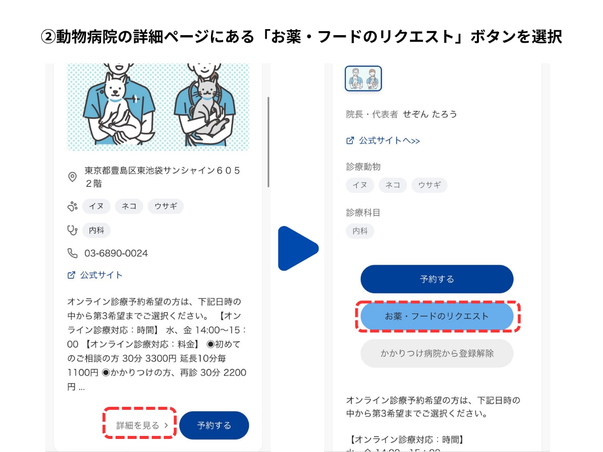 ②動物病院の詳細ページにある「お薬・フードのリクエスト」ボタンを選択