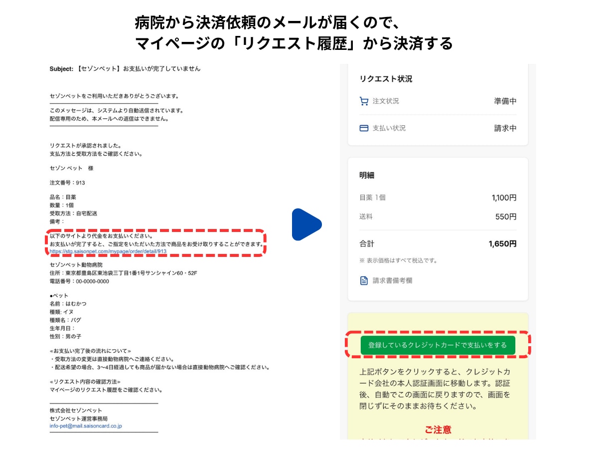 診療終了後、ご登録のメールアドレスに「【セゾンペット】お支払いが完了していません」という件名でメールが届きます。